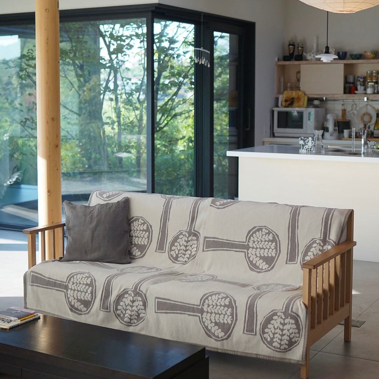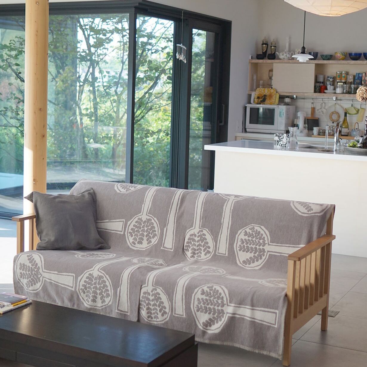 季節や気分に合わせながら、リバーシブルで楽しめる「ソファカバー使い」。2人掛けのソファーにぴったりのサイズ。